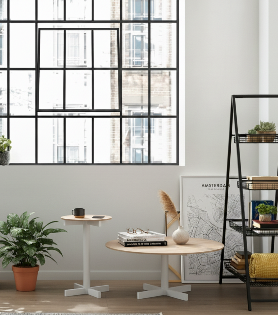 Modern Pedestal Coffee Table: Minimalist Style Meets Function Elevate your living space with this stylish and functional Modern Pedestal Coffee Table. Its clean lines and mixed-material design bring a contemporary, airy feel to any room. Key Features: Elegant Design: Features a smooth, round, light wood (or oak-finish) tabletop that provides ample surface area for drinks, books, and décor. Minimalist Base: Supported by a sturdy, white pedestal column and a distinctive four-spoke/X-shaped base, ensuring excellent stability with a minimal footprint.