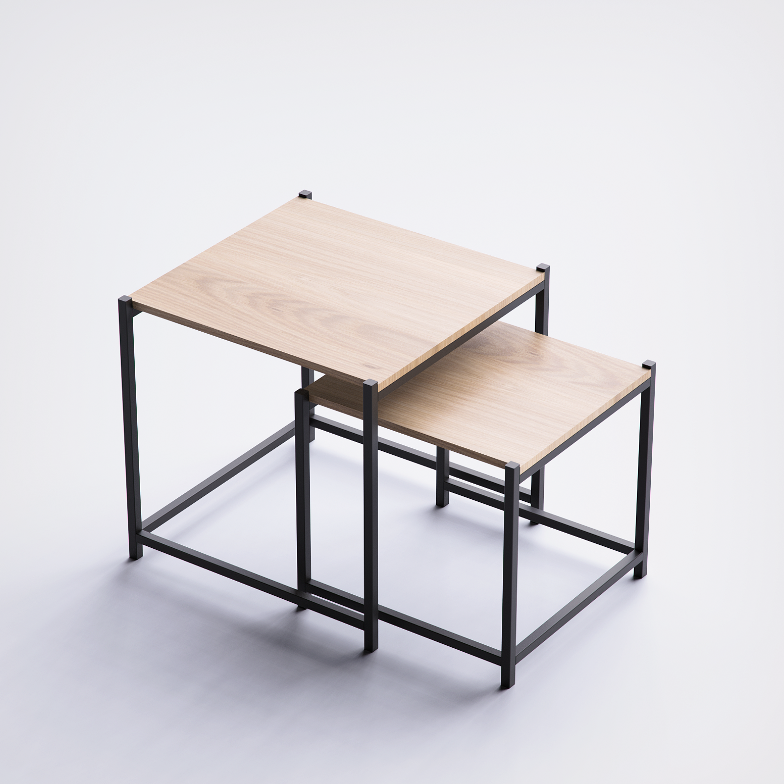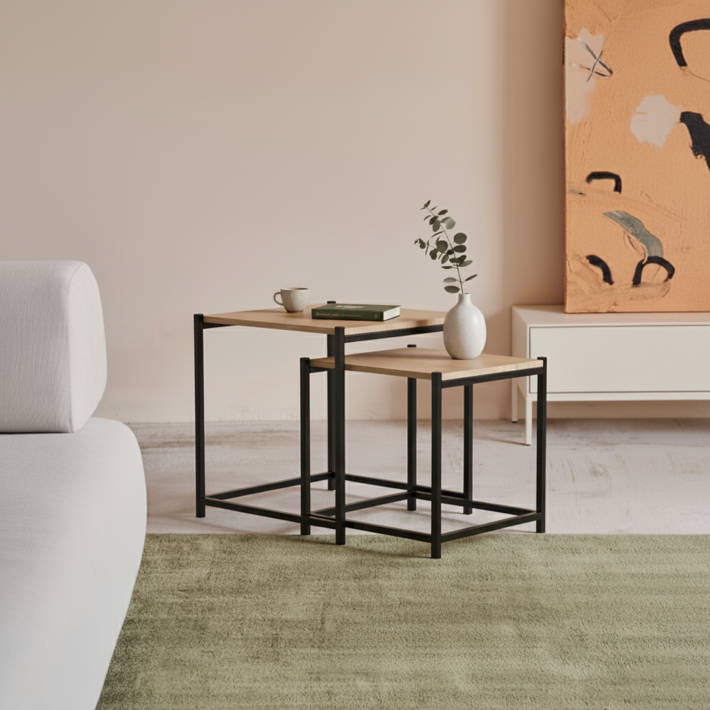 A versatile set of nesting tables designed to adapt to your lifestyle. Crafted with a warm oak wood top and supported by a sleek black metal frame, the Urban Nest combines modern minimalism with everyday functionality. Use them together for a layered look or separately as stylish side tables. Perfect for compact living spaces or as an elegant accent in any room.